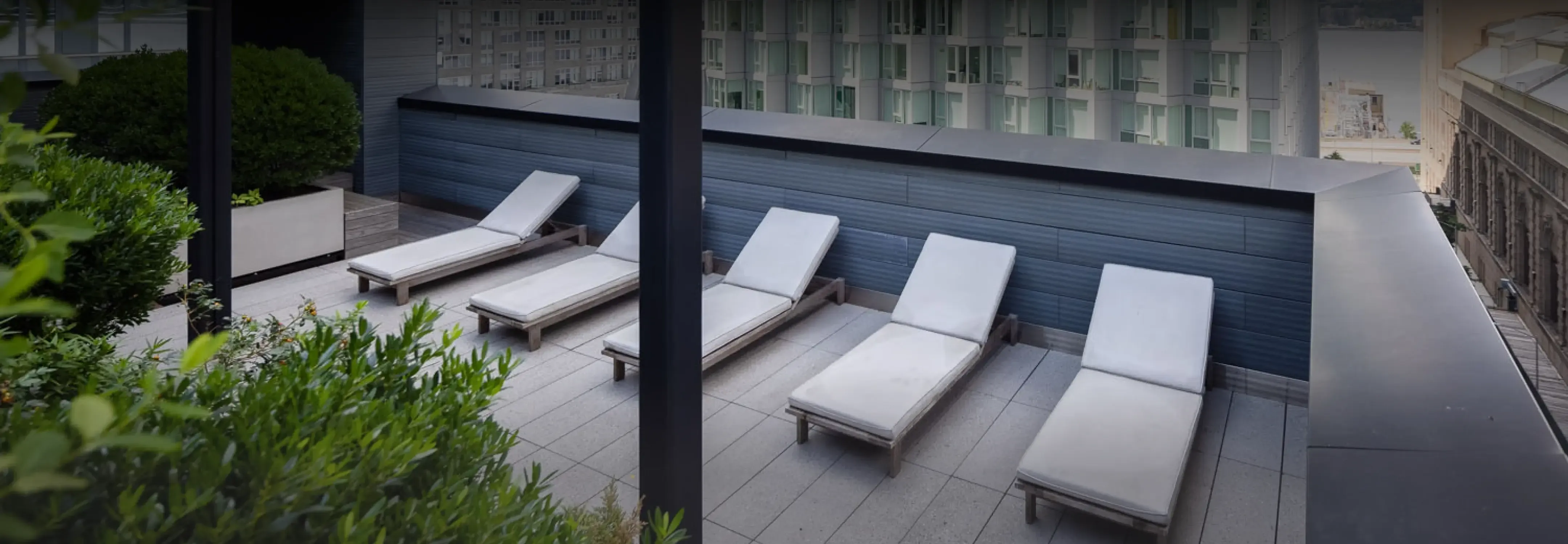 FRANK 57 WEST’s rooftop terrace and sundeck offer views of the surrounding skyline, Riverside Park, and the Hudson River. This beautifully landscaped space is furnished with lounge chairs and offers a pergola-shaded dining area as well.